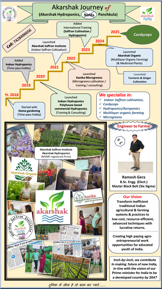 Akarshak Institute of Advanced Farming (since 2018), an MSME-registered company, originally Noida-based, has relocated to Panchkula (Yr. 2024), is a young but fast-growing organisation in the field of advanced Soil-less farming techniques like Indoor Saffron cultivation, Cordyceps (Keedajadi) cultivation, Hydroponics, Aeroponics, Aquaponics, Microgreens, including Multilayer Organic Farming.